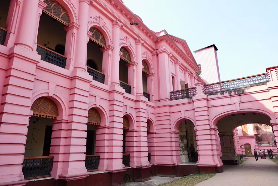 距孟加拉恒河渡口不遠的地方有一座粉紅色宮殿式的豪華建筑。那是1872年一位名叫阿赫桑曼濟勒的地主在法國人留下的倉房基礎(chǔ)上改建的私邸,后來曾在一次龍卷風(fēng)襲擊時受創(chuàng)。李仁奇 攝