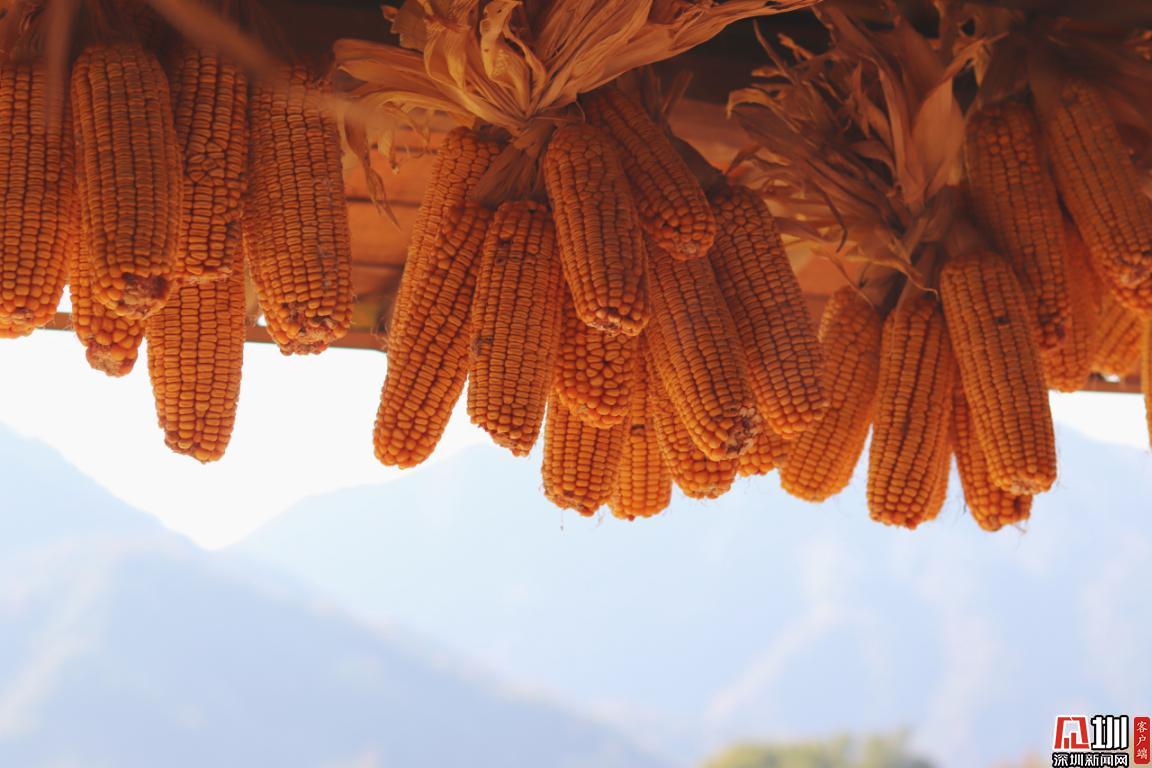 曬架上放著柿子、玉米等五彩繽紛的豐收成果。