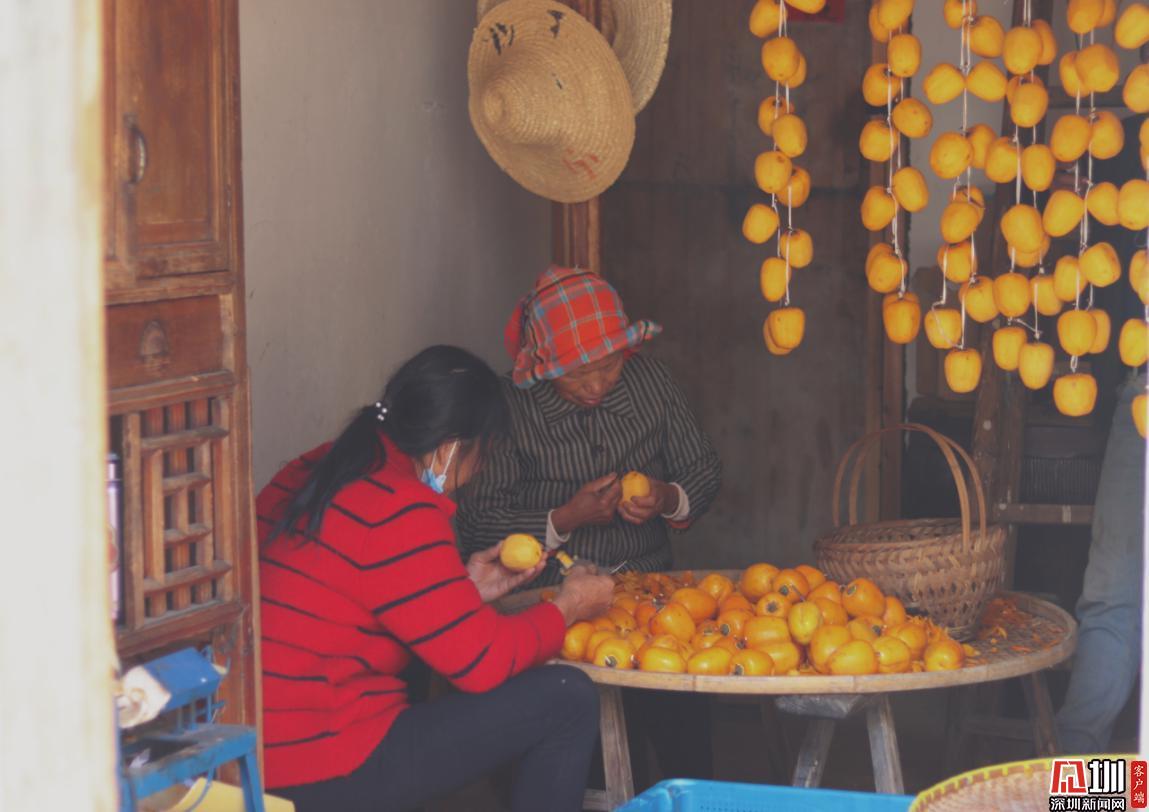 柿子熟透了,齊齊整整地掛在枝丫上,與灰瓦白墻相得益彰。