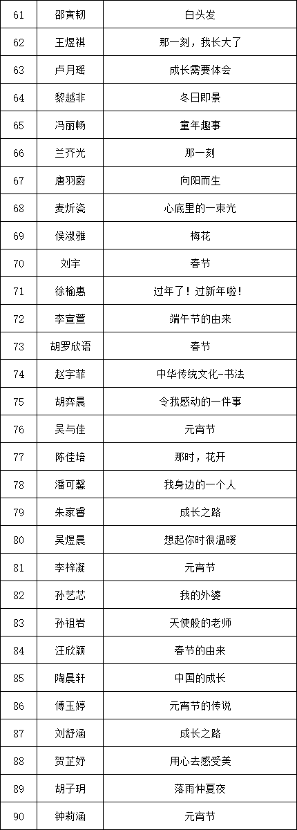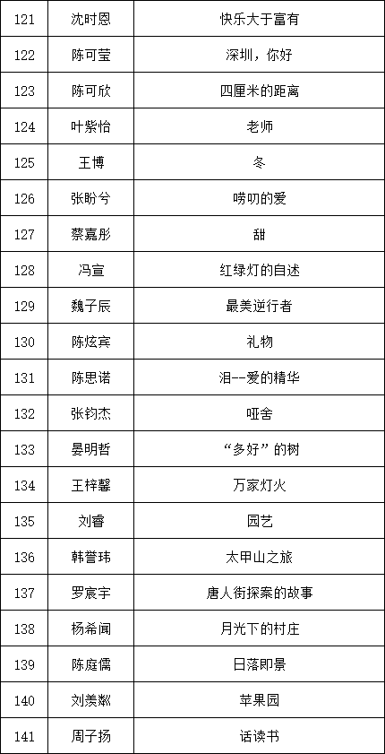 自2021年1月,活動(dòng)征稿啟動(dòng)以來(lái),獲得了深圳市廣大中小學(xué)生、教師、文學(xué)愛(ài)好者的熱烈響應(yīng)積極參與,吸引了深圳百余所學(xué)校的上萬(wàn)人關(guān)注報(bào)名?,F(xiàn)公布龍華區(qū)玉龍學(xué)校專場(chǎng)晉級(jí)復(fù)賽名單如下: