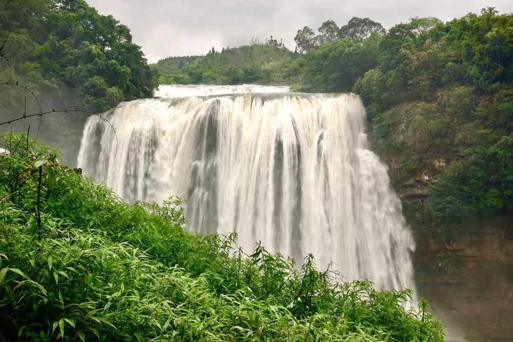 陡坡塘瀑布位于黃果樹瀑布上游1公里處,瀑頂寬105米,高21米,是黃果樹瀑布群中瀑頂最寬的瀑布。李仁奇 攝