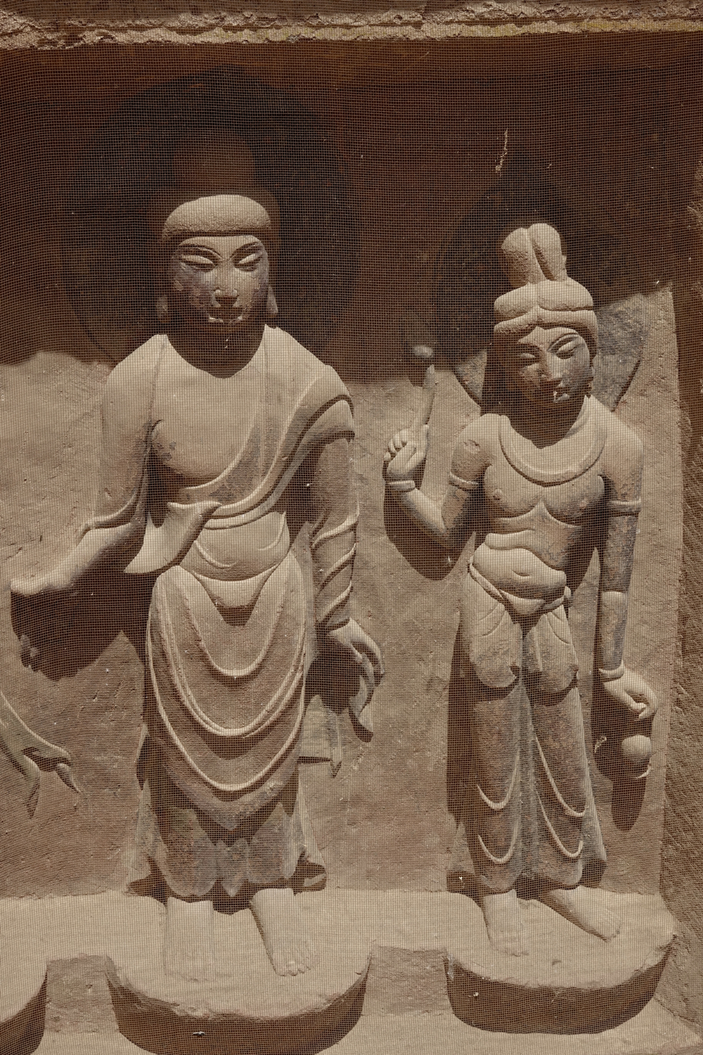 82窟,一結跏趺坐佛二脅侍菩薩,佛左右壁畫二弟子。窟頂和門道露出底層,為北周原作,表層壁畫為明代重繪。李仁奇 攝