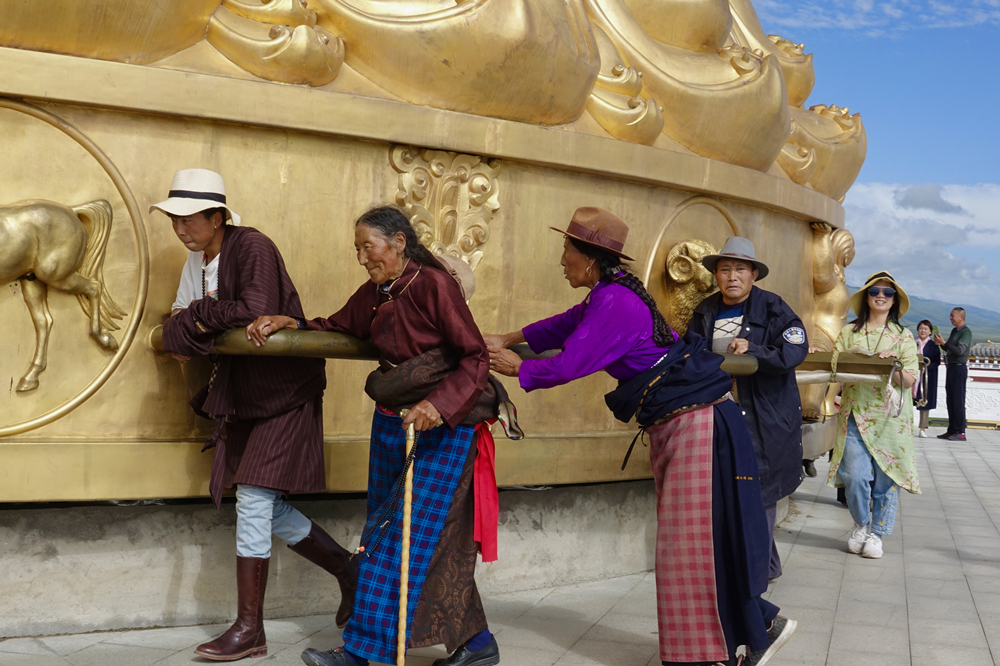 按照藏傳佛教的說法,大轉(zhuǎn)經(jīng)筒上面刻的經(jīng)咒和里面裝的經(jīng)咒比小轉(zhuǎn)經(jīng)筒要多,轉(zhuǎn)一圈劃過的軌跡比小轉(zhuǎn)經(jīng)筒大得多,積累的功德也高得多。李仁奇 攝