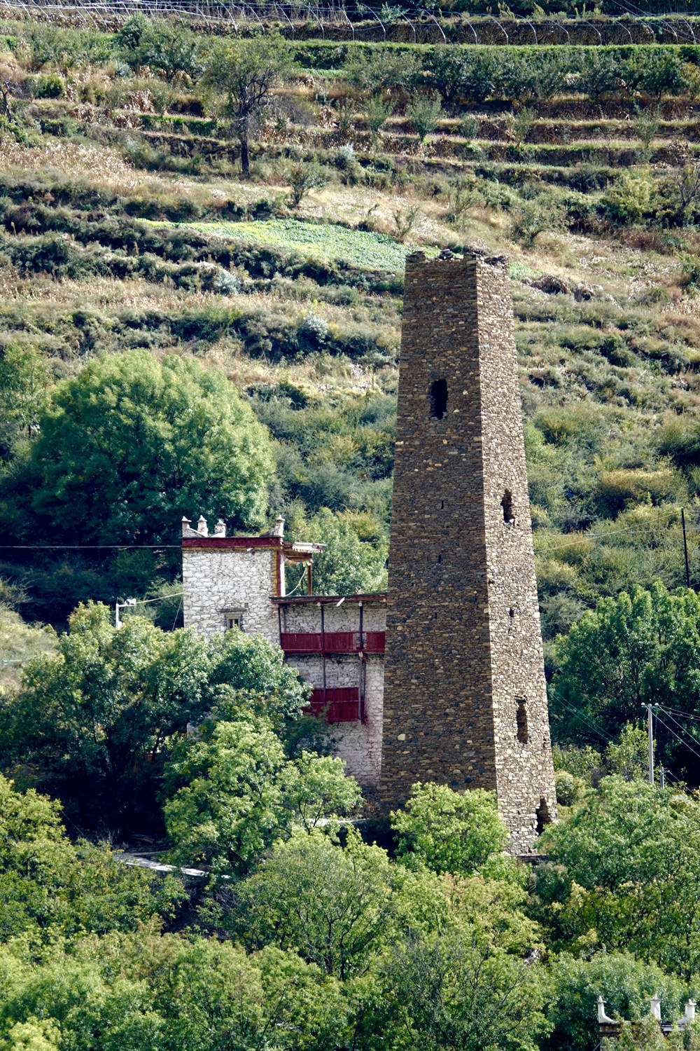 古碉為片石或石塊夾泥砌成,棱角筆直,墻面光滑,下寬上窄,一般高20余米,最高達50米,內(nèi)建樓層十余層至二十余層,每層可容納10余人。李仁奇 攝