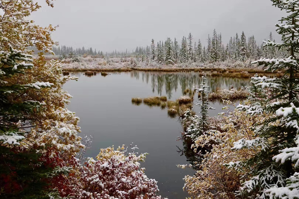 秋季是班夫最美的季節(jié),像九寨溝一樣,在藍(lán)色湖泊、綠色叢林之外,又多出了紅色和黃色的樹(shù)葉,映襯在白色的雪山之中,呈現(xiàn)出一個(gè)五彩繽紛的世界。李仁奇 攝