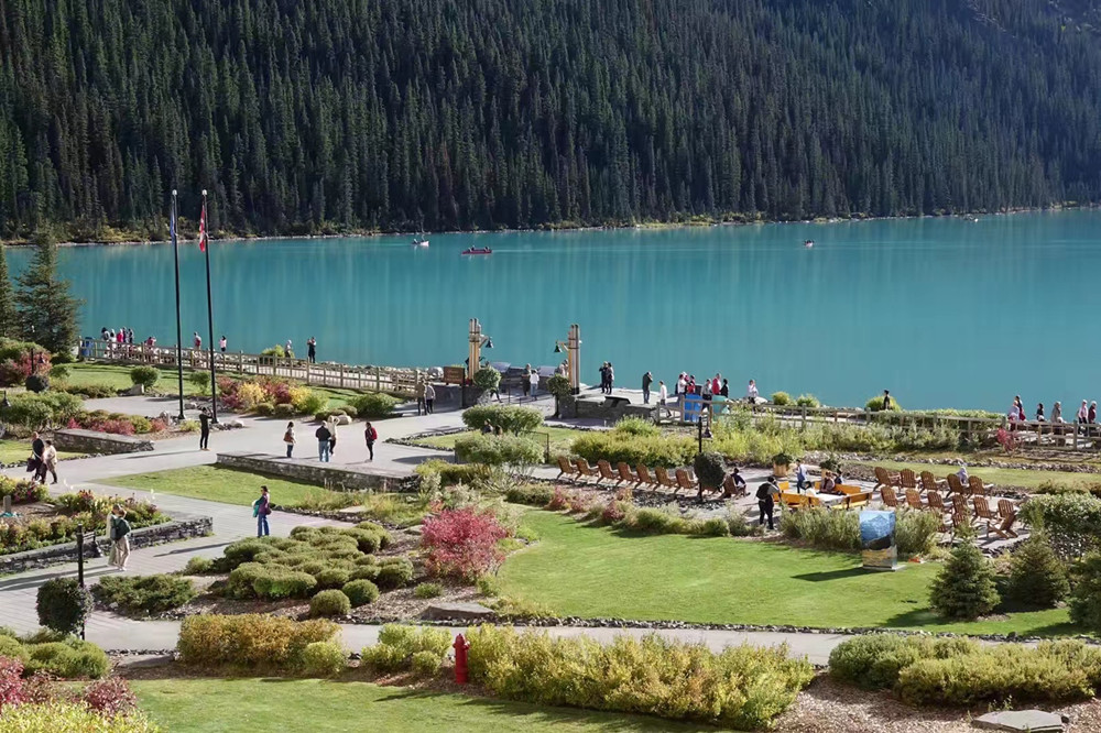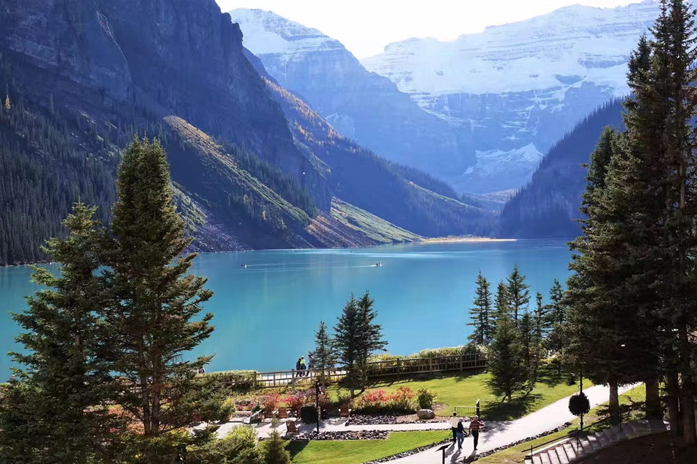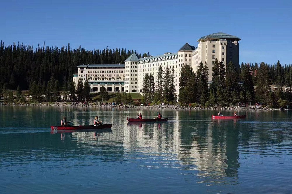 露易斯湖源自維多利亞冰川,湖水碧綠清澈,遠(yuǎn)望就像鑲嵌在落基山脈中的一顆翡翠。李仁奇 攝