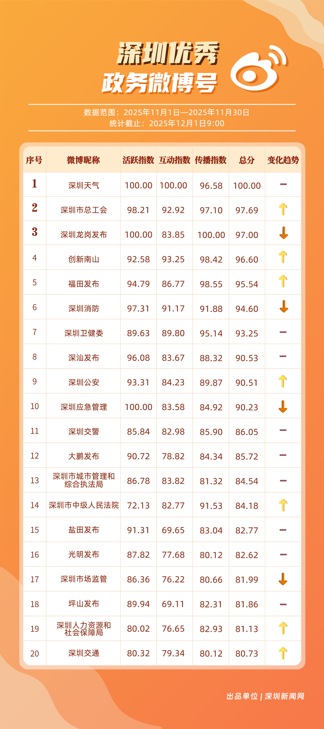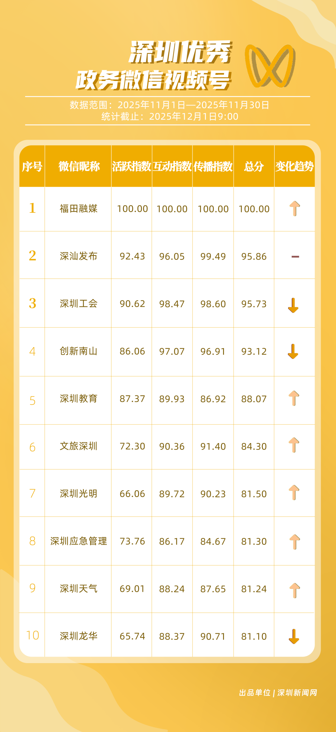 11月,深圳政務(wù)新媒體矩陣持續(xù)深耕內(nèi)容生態(tài),各單位依托平臺特色深化服務(wù)效能,福田區(qū)、南山區(qū)、市衛(wèi)生健康委員會、龍崗區(qū)、市總工會、深汕特別合作區(qū)、市氣象局(臺)、中國共產(chǎn)主義青年團深圳市委員會、龍華區(qū)、市應(yīng)急管理局的新媒體矩陣入選“深圳優(yōu)秀政務(wù)新媒體矩陣”榜單。11月,福田區(qū)新媒體矩陣憑借在微信視頻號、微博平臺的優(yōu)秀內(nèi)容,綜合得分達(dá)到94.51分,位列第一;南山區(qū)新媒體矩陣則依托在抖音平臺的滿分突破,以93.99分位居第二;市衛(wèi)生健康委員會新媒體矩陣在微信公眾號持續(xù)輸出優(yōu)質(zhì)內(nèi)容,總分排名第三位。此外,龍崗區(qū)、市總工會、深汕特別合作區(qū)新媒體矩陣持續(xù)聚焦市民需求,排名相對靠前,展現(xiàn)了深圳政務(wù)新媒體矩陣的活力。