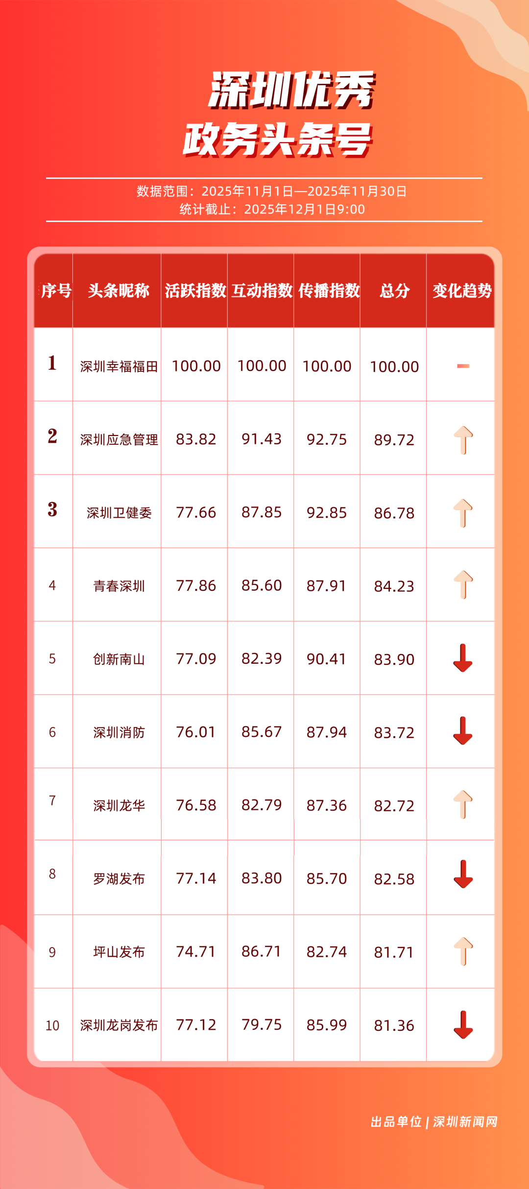 11月,“深圳幸福福田”“深圳應(yīng)急管理”“深圳衛(wèi)健委”“青春深圳”“創(chuàng)新南山”“深圳消防”“深圳龍華”“羅湖發(fā)布”“坪山發(fā)布”“深圳龍崗發(fā)布”共10個政務(wù)頭條號入選“優(yōu)秀政務(wù)頭條號”榜單?!吧钲谛腋8L铩卑l(fā)揮穩(wěn)定,以滿分成績蟬聯(lián)榜首,彰顯出強大的政務(wù)傳播力與影響力;“深圳應(yīng)急管理”積極發(fā)布應(yīng)急、安全類內(nèi)容,位居第二;“深圳衛(wèi)健委”則以優(yōu)質(zhì)健康類信息吸引市民關(guān)注,排名上升至第3位?!扒啻荷钲凇薄皠?chuàng)新南山”“深圳消防”得分在83分以上。相關(guān)上榜賬號以內(nèi)容創(chuàng)新為紐帶,聚焦民生,為城市治理現(xiàn)代化與民生服務(wù)精細(xì)化注入了鮮活力量。