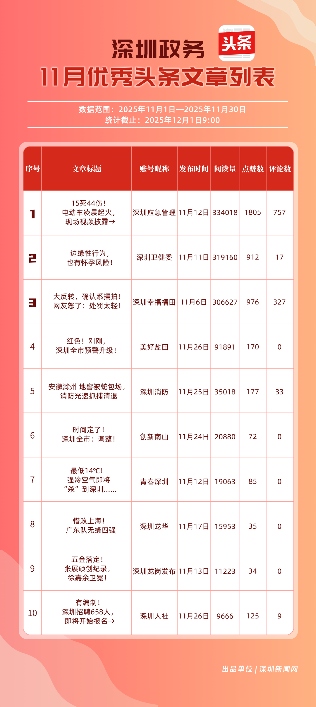 2025年11月期《深圳優(yōu)秀政務(wù)新媒體矩陣》正式發(fā)布,本期上榜矩陣持續(xù)提升傳播效能,通過各類創(chuàng)新實踐在政務(wù)傳播賽道強勢突圍,用“民生關(guān)切+區(qū)域特色”的內(nèi)容創(chuàng)作,攜手構(gòu)建起深圳政務(wù)傳播的新圖景,為政務(wù)新媒體的高質(zhì)量發(fā)展增添新能量。