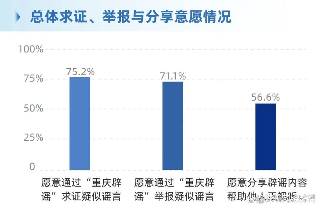·愿意通過(guò)“重慶辟謠”求證疑似謠言的占75.2%,愿意通過(guò)“重慶辟謠”舉報(bào)疑似謠言的占71.1%,愿意分享辟謠內(nèi)容幫助他人正視聽(tīng)的占56.6%。