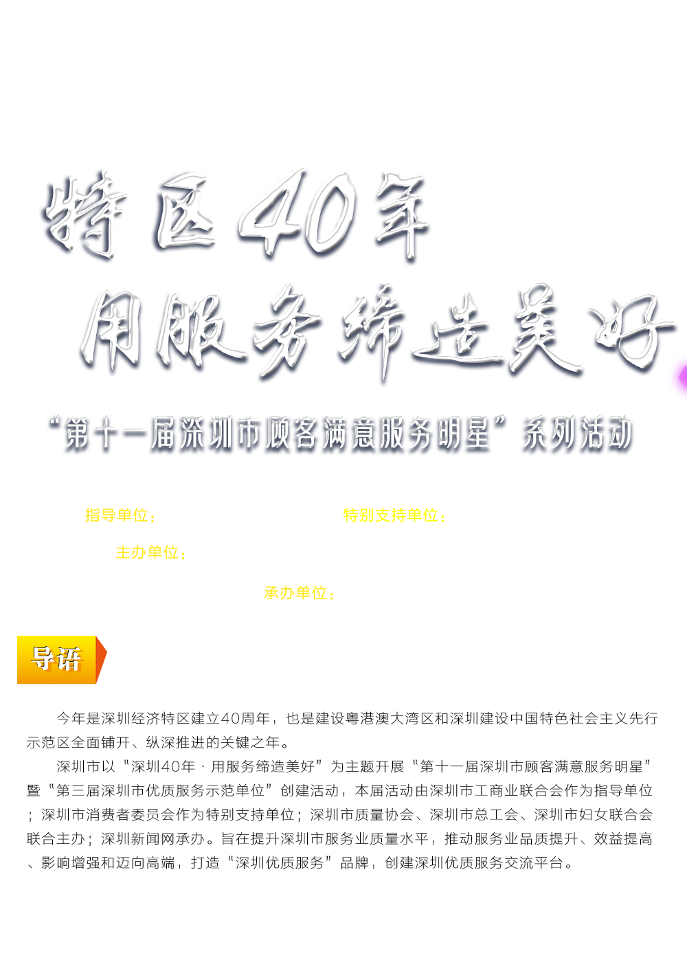 第十一屆顧客滿意服務(wù)明星活動現(xiàn)場深圳市政協(xié)常委、深圳市質(zhì)量協(xié)會執(zhí)行會長李榕致辭200余人參加第十一屆顧客滿意服務(wù)明星活動頒獎典禮深圳機(jī)場、深圳燃?xì)?、華夏銀行深圳分行榮獲“優(yōu)質(zhì)服務(wù)示范單位”稱號廣東省深圳市深圳公證處等22家單位獲得“顧客滿意服務(wù)明星單位”稱號陳傳龍、陳繁華等10位同志獲得“第十一屆深圳市顧客滿意服務(wù)杰出管理者”稱號“生命之星”班組等50個團(tuán)隊(duì)獲得“明星團(tuán)隊(duì)”稱號陳華等70位同志獲得“第十一屆深圳市顧客滿意服務(wù)明星(個人)”稱號